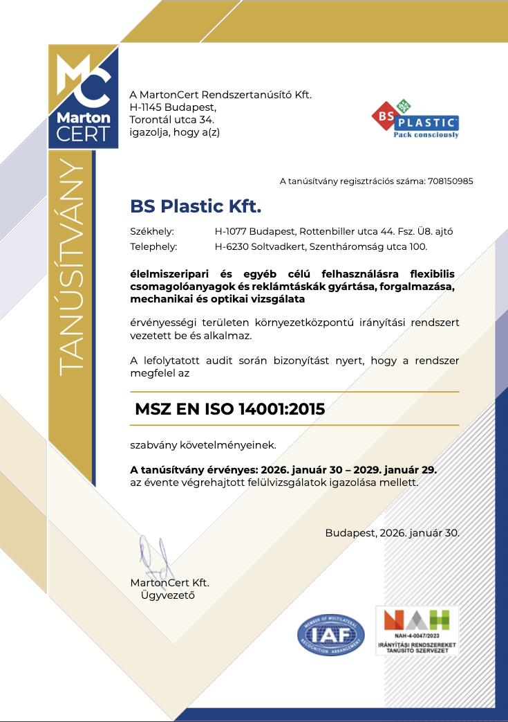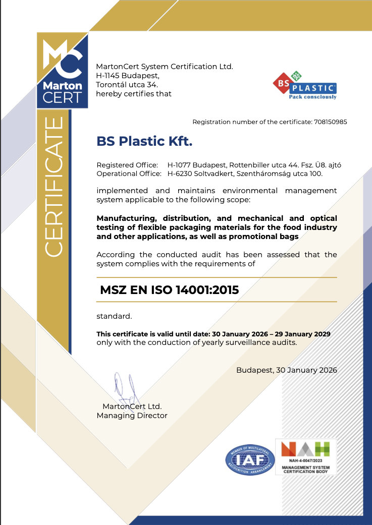 A BS Plastic™ környezetbarát társaságként komposztálható és biológiailag lebontható termékeket hoz forgalomba. Hogy hitelességünket bizonyítsuk, választottuk ezt a tanúsítási rendszert.